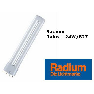 Συμπαγής λαμπτήρας φθορισμού ΡΆΔΙΟ RX-L 24W/827/2G11 ( RADIUM RALUX Καιρό-24W 827 ). Λάμπα φωτός των υψηλής ποιότητας. Δύναμη 24W. Συμπαγής φθορισμού με ξεχωριστή τροφοδοσία, που αποτελείται από ένα μακρύ σωλήνα διπλωμένο. Λάμπα φωτός 4-pin connector ( 4 pin ). Κύκλος ζωής 10000 ώρες. Βάση 2G11. Απόχρωση : θερμό άσπρο 2700K. Πολύ καλή φωτεινή ροή.