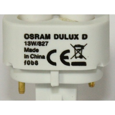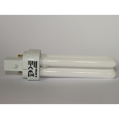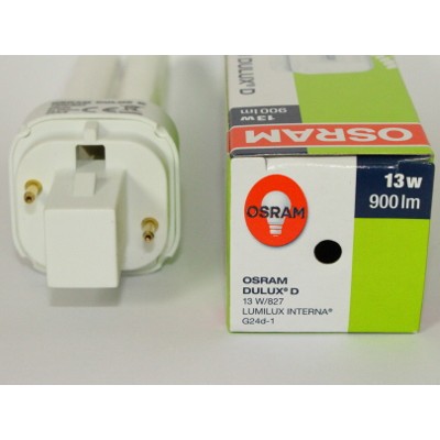 Compact fluorescent lamp DULUX D 13W/827 brand OSRAM. Light bulb of the highest quality. Power 13W. Compact fluorescent with a separate power supply, consisting of two tubes bent. Bulb 2-pin ( 2 pin ). Life span 10000 hours. Culot G24d-1. Hue : warm white 2700K. Very good luminous flux.