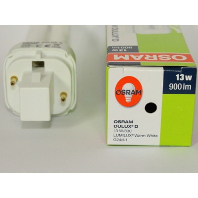 Compact fluorescent lamp DULUX D 13W/830 brand OSRAM. Light bulb of the highest quality. Power 13W. Compact fluorescent with a separate power supply, consisting of two tubes bent. Bulb 2-pin ( 2 pin ). Life span 10000 hours. Culot G24d-1. Hue : warm white 3000K. Very good luminous flux.