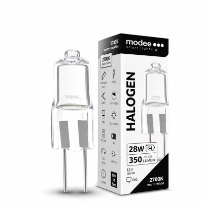ECO G4 28W 12V halogen bulb delivering 350 lumens with 2700K warm white light. Dimmable, instant start, low heat emission and 2000-hour lifespan. Ideal for replacing OSRAM and PHILIPS halogen bulbs, providing stable, natural light for G4 fixtures.