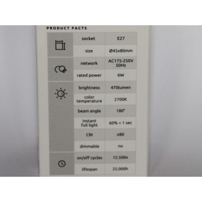 Bombilla LED esférica G45 6W/827 E27. No caliente, tan brillante como la luz de una bombilla halógena de 60W ( 470 lm ) sólo consume 6W. Luz cálida en 2700K. Socket E27. Dimensiones 45 ( diámetro ) X 86. Voltaje 220 - 240V. La tecnología LED. Clase de eficiencia energética A+.