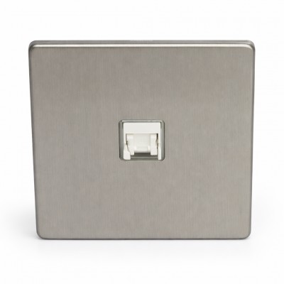 Elegante toma de Internet RJ45 de Categoría 6 en acero cepillado, que ofrece una instalación sencilla. Fabricada con precisión en la Unión Europea, este producto de alta gama se distingue por su acabado impecable. Diseñada para satisfacer a una clientela exigente, esta toma RJ45 de acero cepillado encarna la refinación y calidad.