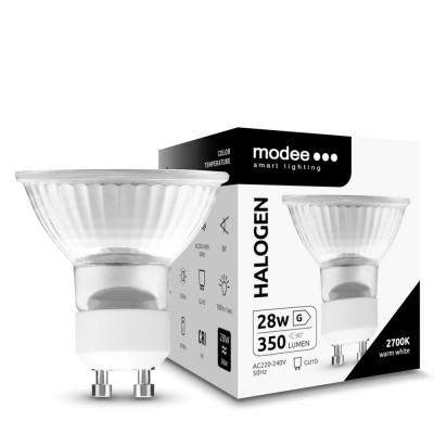 Bombilla halógena ECO GU10 28W, ideal como sustitución directa de las bombillas PHILIPS GU10 28W. Emite una luz blanco cálido de 2700 K, ofrece un flujo luminoso de 350 lm, es regulable y garantiza una excelente reproducción cromática. Perfecta para focos empotrados, plafones e iluminación interior acogedora.