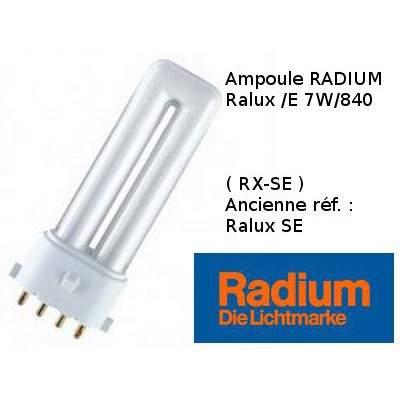 Ampoule fluocompacte RX-S/E 7W/840/2G7 ( ou RALUX S/E 7W 840 ) de marque RADIUM. Ampoule de qualité irréprochable. Puissance 7W. Fluocompacte à alimentation séparée, constituée d'un tube pliée. Ampoule à 4 broches ( 4 pin ). Durée de vie 10000 heures. Culot 2G7. Teinte : blanc froid 4000K. Très bon flux lumineux.