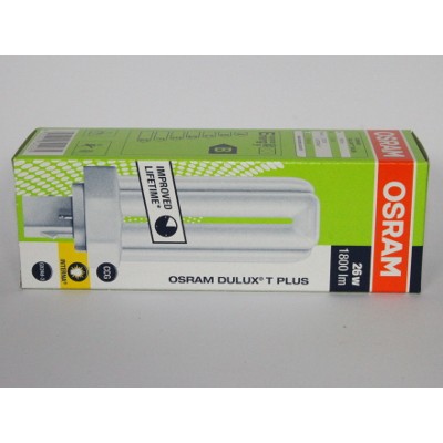 Lâmpadas fluorescentes compactas da OSRAM DULUX T 26W/827 PLUS. Lâmpada fluorescente compacta com fonte de alimentação separada. Potência de 26W. Soquete GX24d-3. Branco morno ( 827 ). EAN 4050300342085