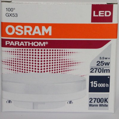 OSRAM LED GX53 3,5 W 2700K 270 lúmen. A tecnologia LED. Tensão de 230V. Soquete GX53. Para a substituição de lâmpadas fluorescentes compactas / LED GX53 . Luz quente em 2700 Kelvin. Classe energética : A