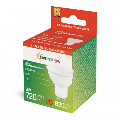 Лампа LED GU10 230V 9W SMD WW с матовым белым рассеивателем SPECTRUM LED обеспечивает 720 люмен, идеально подходящих для помещений. Тёплый белый свет 3000K и широкий угол свечения 110° гарантируют равномерное освещение и создают уютную атмосферу.